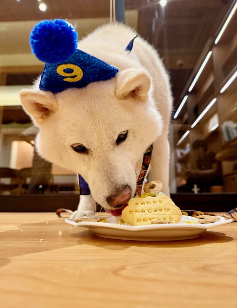 ぼくは9歳になりました 日課の館内パトロールと記念撮影とお見送りをして、お散歩とご飯を楽しみにのんびり過ごしているこの頃です 今年の春に舞子お姉ちゃんが旅立って、いつも隣りにいたのに居なくて、ご飯もおやつも半分子しなくなって、思い出すとやっぱり寂しいな。ぼくも舞子お姉ちゃんを見習って、6代目の看板犬として元気に過ごしていくよ。